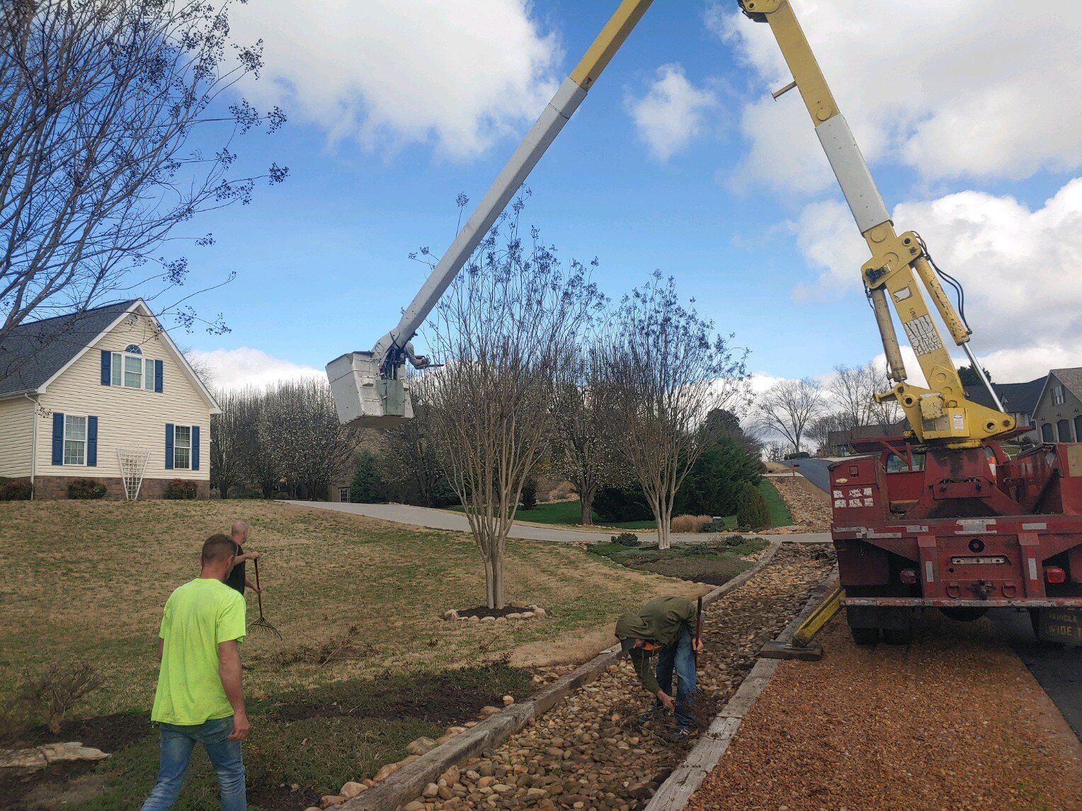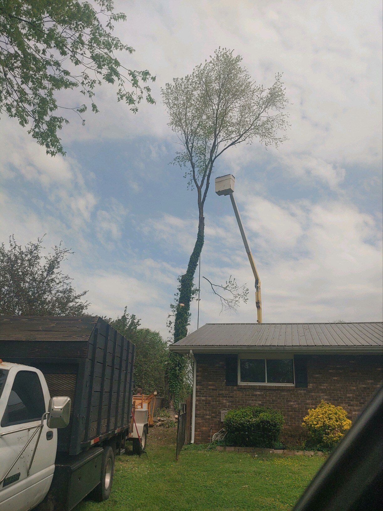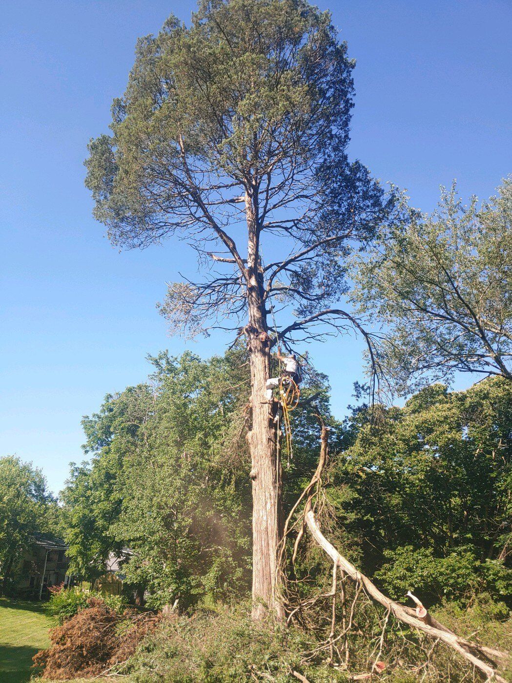 A tree is being removed from a yard in front of a house.