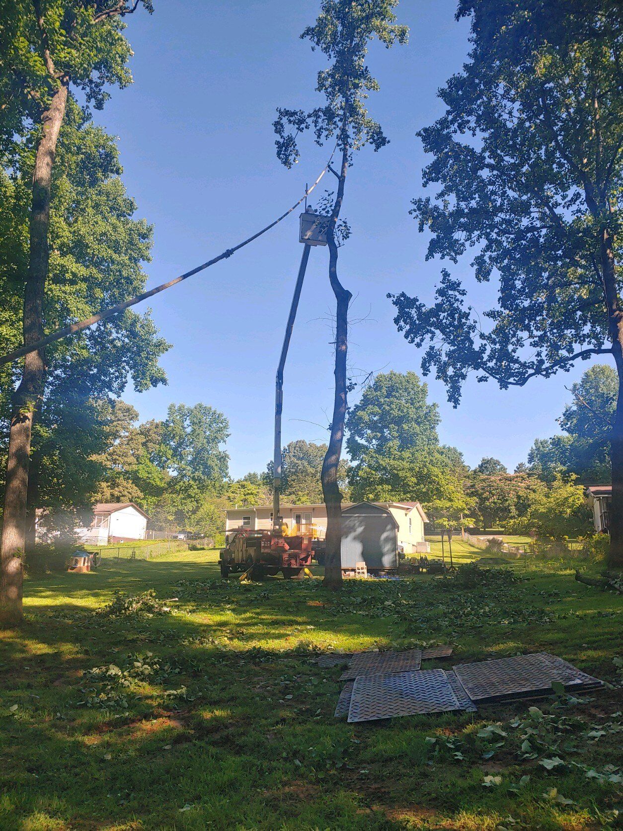 A man is cutting a tree in a backyard with a crane.