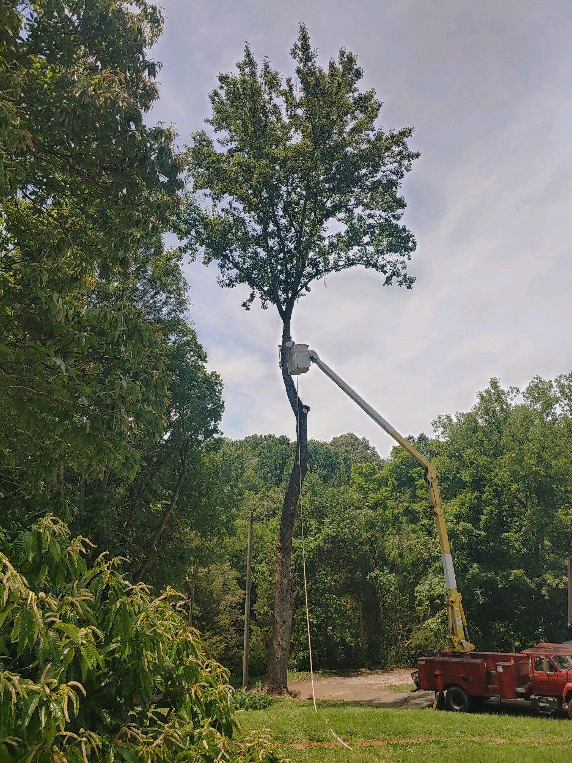 A man in a bucket is cutting a tree in a backyard.
